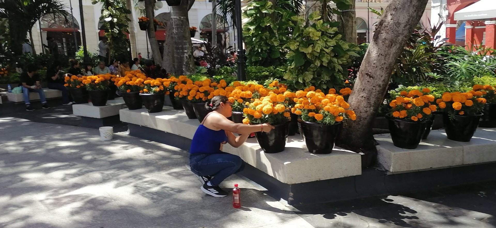 Adornan con flor de cempasuchil y calaveras el Zócalo de Veracruz