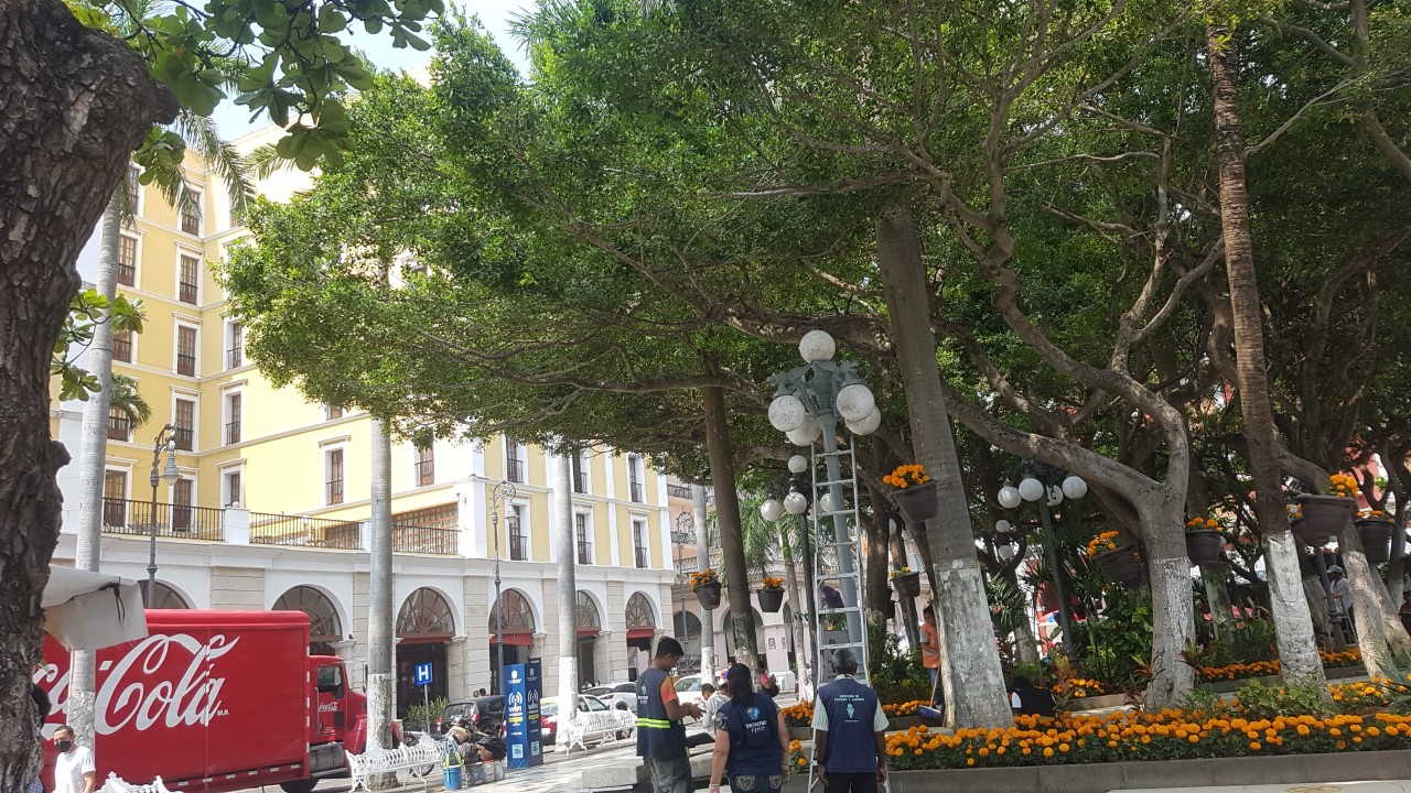 ADORNAN JARDÍNERAS DEL ZÓCALO DE VERACRUZ CON FLOR DE CEMPASÚHIL.