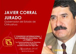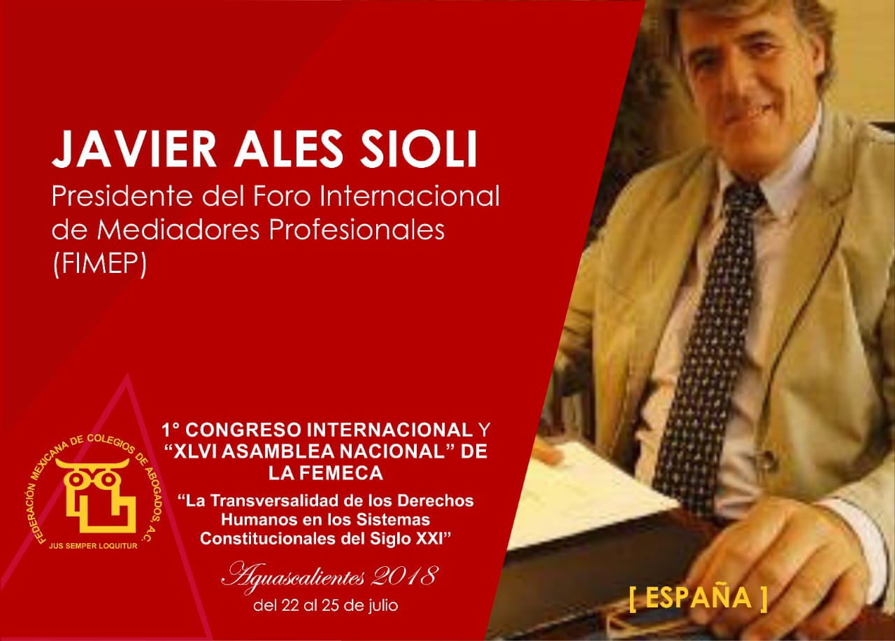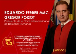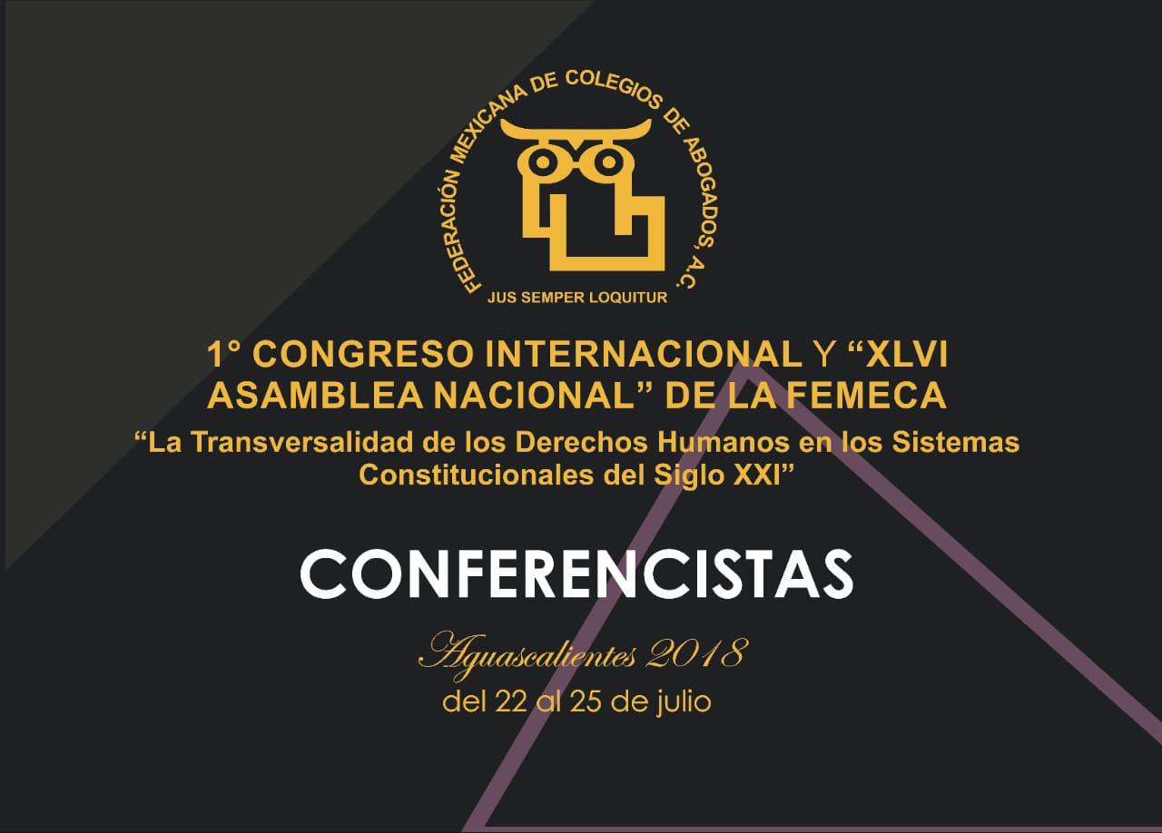 A este este primer congreso internacional de la Femeca asisten como conferencistas:Eduardo Ferrer Macgregor Poisot presidente de la Corte Interamericana de Derechos Humanos;Javier Ales Sioli presidente del Foro Internacional de Mediadores Profesionistas(FIMEP);Iris Díaz Cedeño Académica del Instituto de Estudio e Investigación Jurídica(INEJ);Javier Corral Jurado Gobernador del Estado de Chihuahua;Digna Atencio Bonilla Académica del Instituto e Investigación Jurídica(INEJ);Sergio J. Cuarezma Terán Vicerrector del Instituto de Estudio e Investigación Jurídica(INEJ);Boris Gómez Uzqueda ex secretario de Energía de Bolivia;César Augusto Espejel Fiscal General del Estado de Chihuahua, Margaritza Zavala Gómez del Campo;Lorena Martínez Rodríguez;Pedro Salazar de la Peña Gómez;Fauzi Hamdam Amab y Rodolfo Félix Cárdenas entre otros.
