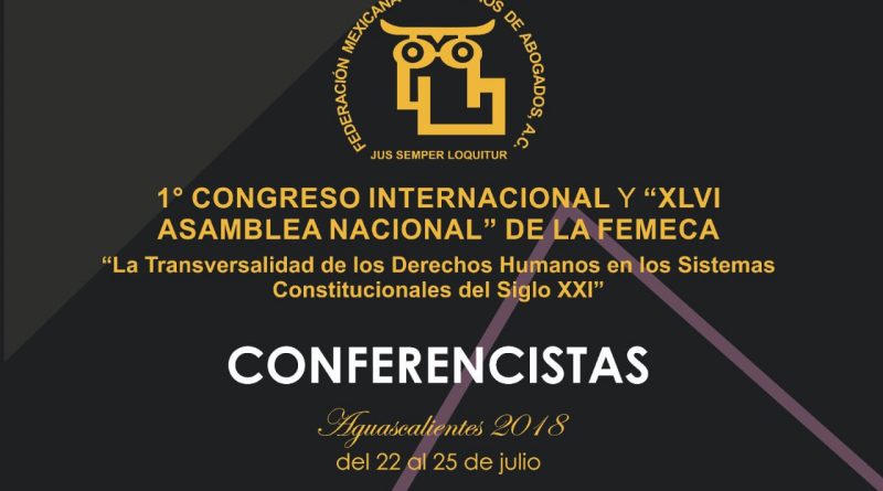 Veracruz, Ver.-5 de Junio 2018.-La Federación Mexicana de Colegios y, Abogados A.C que preside a nivel nacional el doctor José Luis González Martínez convocan al Primer Congreso Internacional y «XLVI Asamblea Nacional «de la FEMECA que se llevará a cabo en Aguascalientes del 22 al 25 de Julio y, en donde se contará con la presencia de conferencista de talla nacional e internacional.