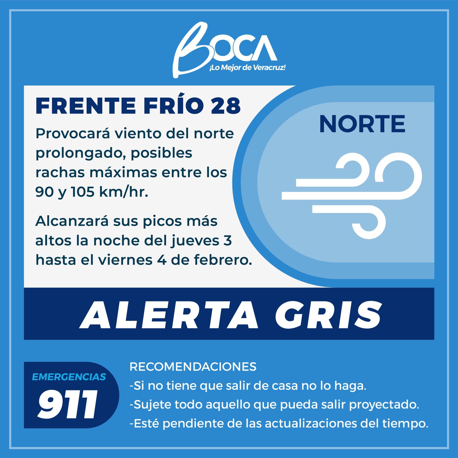 *Alerta Gris en Boca del Río; vientos del norte con posibles rachas de 90 a 105 km/h*