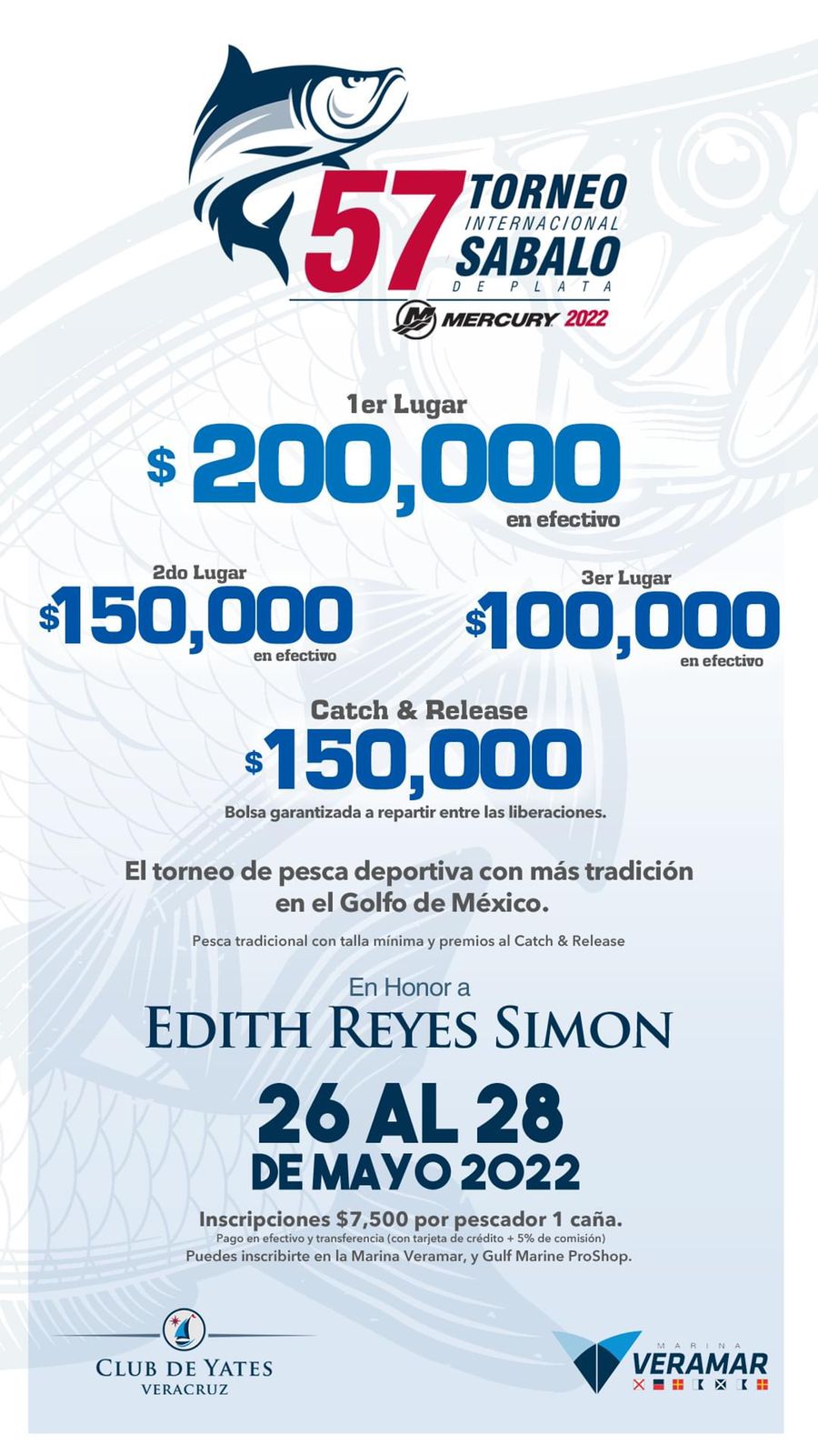 (Veracruz, Ver., a 21 de abril de 2022).- El director de Torneos del Club de Yates Veracruz, Gregorio Chedraui Bolado confirmó la gran bolsa de premiación que se brindará a los ganadores de la edición #57 del Torneo Internacional del Sábalo de Plata Mercury 2022, del 26 al 28 de mayo.