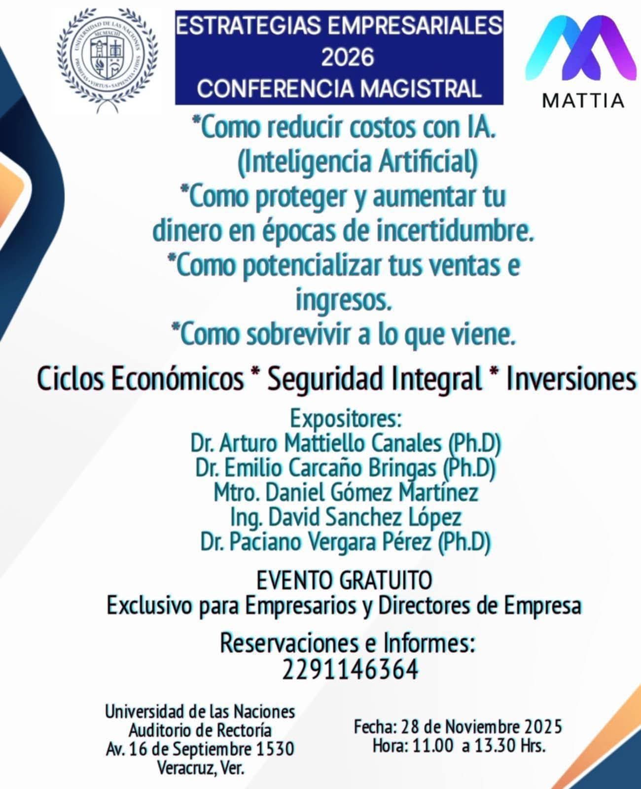 Habrá Importantes e interesantes conferencias magistrales este 28 de Noviembre de 11 a 13:30 horas en el Auditorio de la Universidad de las Naciones.