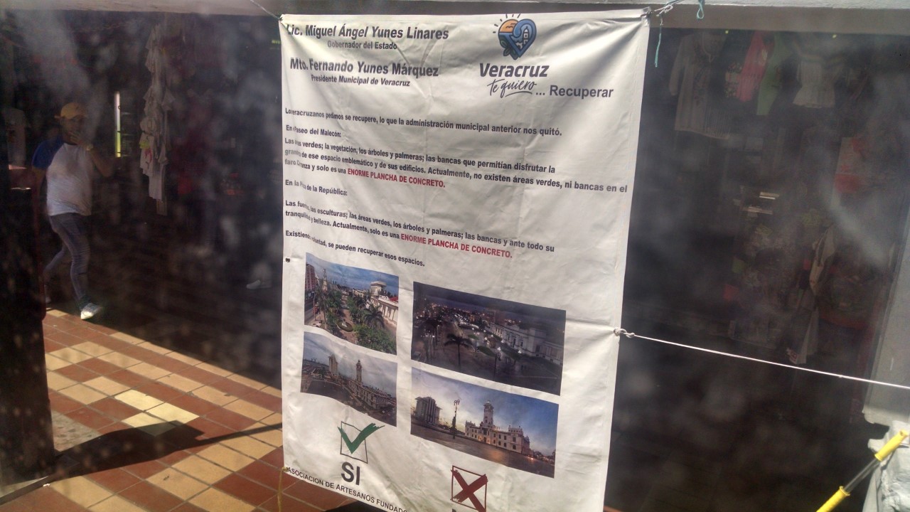 Integrantes de la Asociación de Artesanos Fundadores del Malecón de Veracruz y, que liderea el arquitecto Angel Hernández Ramos instalarón en este espacio turístico una manta donde piden al Gobernador del Estado MAYL y, a su hijo el alcalde de Veracruz Fernando Yunes Márquez recuperen las áreas y, la vegetación que destruyó la administración pasada encabezada por el ex alcalde priista Ramón Poo Gil.
