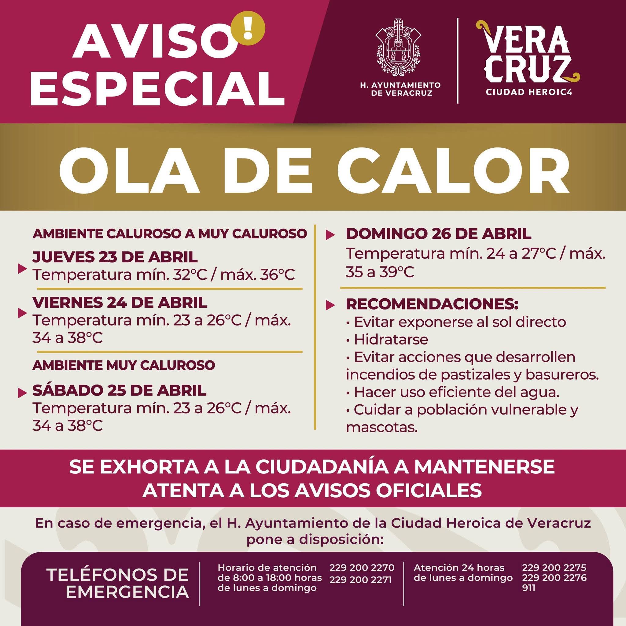La dirección de Protección Civil (PC) municipal de Veracruz informa a la población que durante los próximos días se prevé una ola de calor con temperaturas de hasta 39 grados Celsius en la ciudad, por lo que se recomienda cuidarse y tomar precauciones para prevenir golpes de calor y posibles afectaciones a la salud.