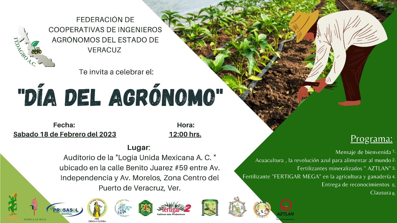 Dijo que en esta ocasión se celebrará el día del ingeniero agrónomo en el Auditorio de la «Logia Unida Mexicana A.C», ubicado en la calle de Benito Juárez número 59 entre Av.Independencia y Av. Morelos, Zona Centro del Puerto de Veracruz.