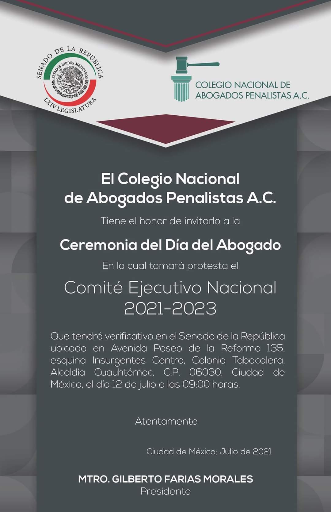 Al respecto el licenciado Gilberto Farías Morales presidente del Colegio Nacional de Abogados Penalistas A.C explicó que la ceremonia se llevará a cabo en el Senado de la República ubicados en el Paseo de la Reforma 135,esquina Insurgentes Centro,Colonia Tabacalera.Alcaldía Cuauhtémoc. C.P.06030. Ciudad de México, el día 12 de Julio a las 9 horas.