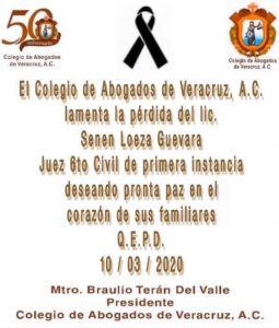 Veracruz, Ver. a 11 de Marzo 2020.-El Colegio de Abogados de Veracruz AC. que preside el Mtro. Braulió Terán del Valle lamenta la pérdida del licenciado Senen Loeza Guevara Juez 6to. Civil de Primera Instancia, deseando pronta paz en el corazón de sus familiares. Q.E.P.D.