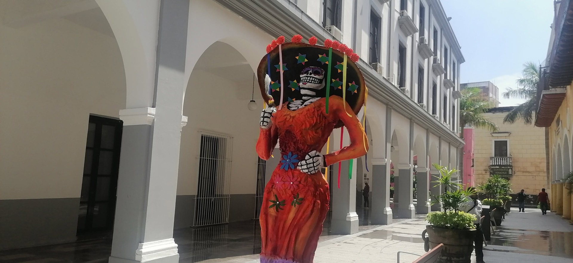 Veracruz, Ver. A 21 de Octubre 2025.. A casi 9 días Del inicio de las tradicionales fiestas de Día de los Muertos, autoridades municipales colocaron esta mañana una catrina a un costado del Palacio Municipal y el Edificio Trigueros.