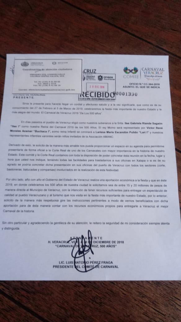 El pasado 20 de diciembre del 2018 se envió un oficio dirigido al Ejecutivo del Estado por parte de esta oficina para solicitarle una cita para presentarles formalmente a los integrantes de la Corte Real electa 2019, de la cual se adjunta copia del documento y que al momento no se ha tenido respuesta.