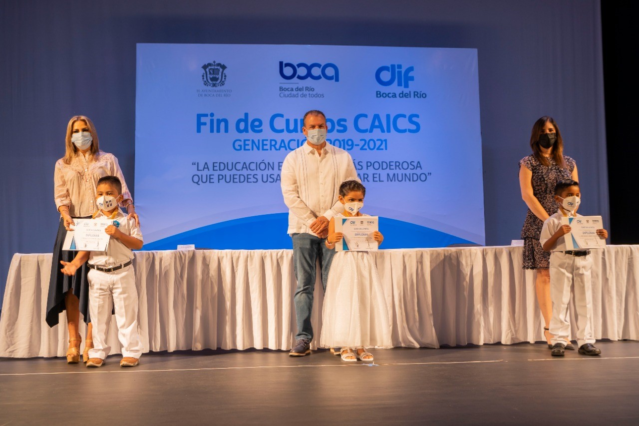 BOCA DEL RÍO,VER.-El presidente municipal de Boca del Río Humberto Alonso Morelli acompañado de su esposa Karla Robles de Alonso y la directora de Educación Verónica Blanco entregaron reconocimientos a 100 alumnos de los de los Centros de Atención Comunitarios (CAICS) de San José Novillero, Villa Rica, Las Vegas y Miguel Alemán quienes concluyeron el nivel básico de educación quedando clausuradas las actividades de la generación 2019-2021.
