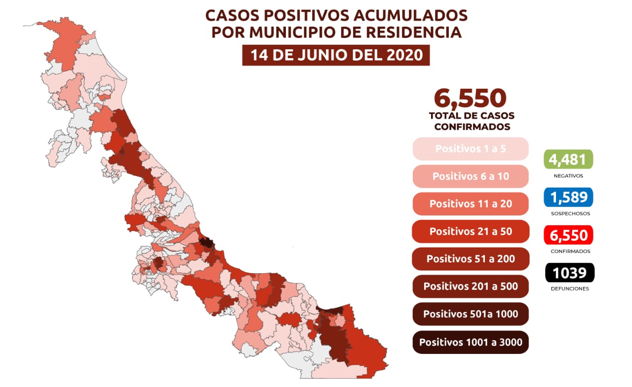 La cifra de positivos acumulados es de 6 mil 550 en 154 demarcaciones; 3 mil 803 recuperados, mil 708 en vigilancia y 875 activos: Veracruz *2375*, Coatzacoalcos *686*, Poza Rica *473*, Minatitlán *287*, Boca del Río *265*, Córdoba *208*, Xalapa *165*, Tuxpan *163*, Cosoleacaque *107*, Orizaba *102*, Medellín *98*, Papantla *96*, Cosamaloapan *87*, San Andrés Tuxtla *78*, Fortín *63*, Coatzintla *62*, Martínez de la Torre *58*, Tierra Blanca *50*, Nanchital *48*, Tihuatlán *47*, Alvarado *45*, Las Choapas *43*, La Antigua *39*, Perote *37*, Agua Dulce *35*, Jáltipan *34* y Acayucan *31*.