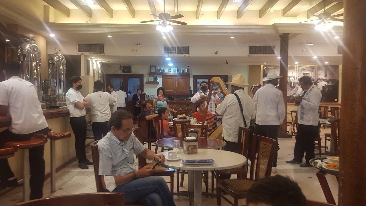 Veracruz,Ver.- El folclor veracruzano a todo lo que da en el tradicional Gran Café del Portal de la Ciudad de Veracruz,familias de turistas se divierten con este grupo de jarochos mientras estos disfrutan de la gastronomía que aquí se expende. Foto Ausencio RIVERA.