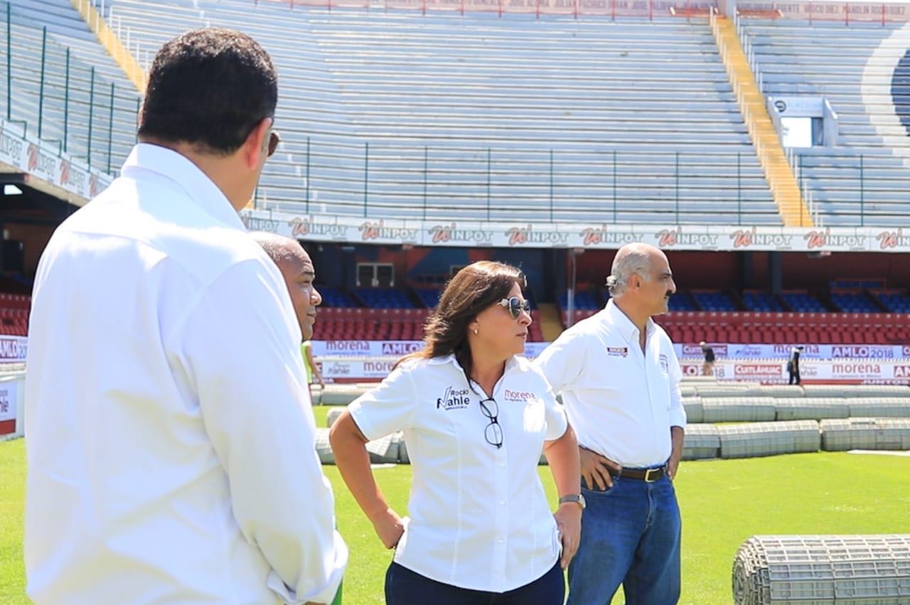 En el video se observa a Rocío Nahle junto con su compañero de fórmula Ricardo Ahued recorriendo la cancha, los túneles, los pasillos y los palcos del inmueble, para cuidar todos los detalles del magno evento.