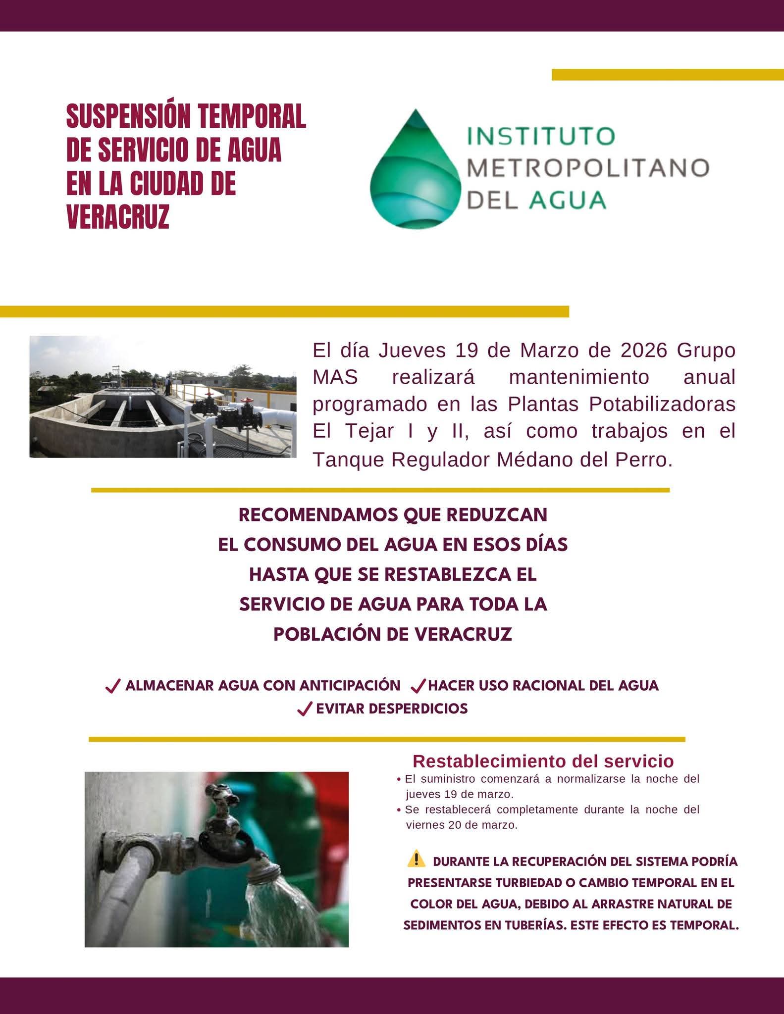 Debido al mantenimiento preventivo anual en las plantas potabilizadoras El Tejar I y II y en el tanque regulador Médano del Perro, el Instituto Metropolitano del Agua (IMA) exhorta a la ciudadanía a tomar previsiones ante la suspensión temporal del servicio de agua potable en toda la ciudad de Veracruz, el próximo jueves 19 de marzo, por lo que recomienda almacenar agua con anticipación y hacer un uso racional del vital líquido.