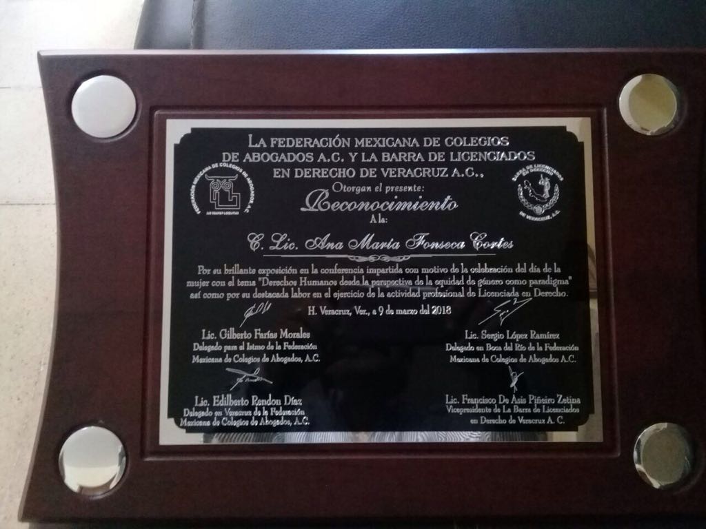 Cabe mencionar que al termino de la Conferencia la FEMECA y, la Barra de Licenciados en Derecho de Veracruz AC otorgaron un merecido reconocimiento a la licenciada Ana María Fonseca Cortés por su brillante exposición en la conferencia impartida con motivo de la Celebración del Día Internacional de la Mujer.