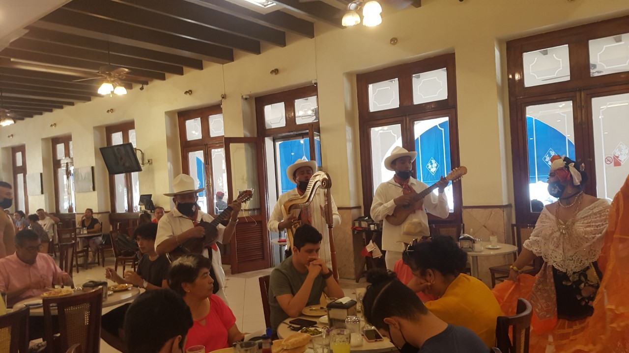 Veracruz,Ver.- a 15 de Agosto 2022.- Grupo de jarochos divierten a turistas con canciones propias del puerto, mientras los visitantes desayunan tranquilamente y escuchan las melodías que cantan los músicos. Mientras tanto una mujer vestida jarocha baila al ritmo de la música. Foto Ausencio RIVERA.
