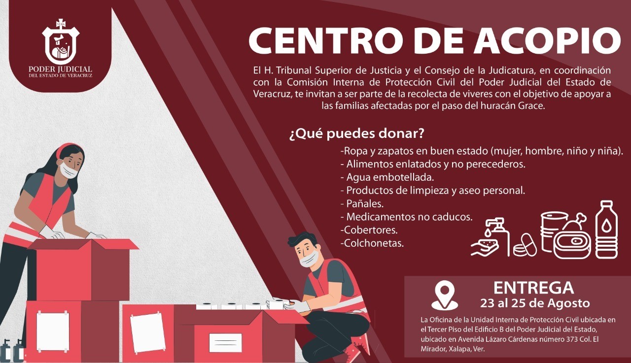 “El Tribunal Superior de Justicia y del Consejo de la Judicatura en coordinación con la Comisión Interna de Protección Civil del Poder Judicial del Estado de Veracruz te invitan a ser parte de la recolecta de víveres con el objetivo de apoyar a las familias afectadas por el paso del huracán Grace en territorio veracruzano”.