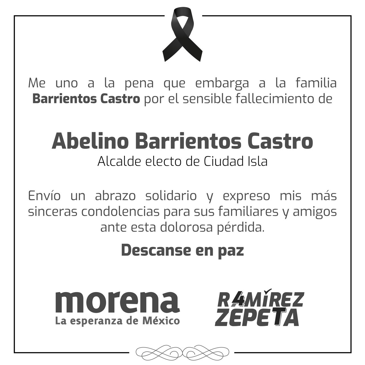 El dirigente de Morena en la entidad envió a la familia Barrientos Castro, a sus amigos y al equipo que lo acompañó, sus condolencias, deseándoles fuerza y consuelo ante la pérdida. Reconoció el trabajo que caracterizó a Abelino Barrientos, no solo como militante del partido y candidato en la campaña electoral de este año, sino además como ciudadano comprometido con su comunidad.