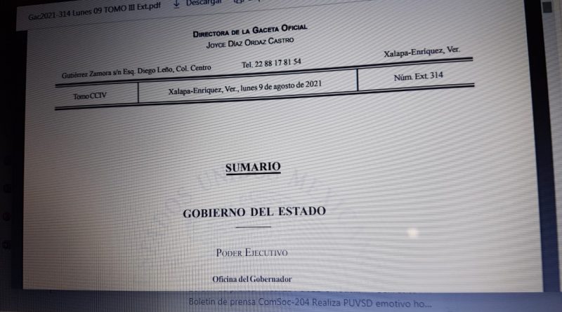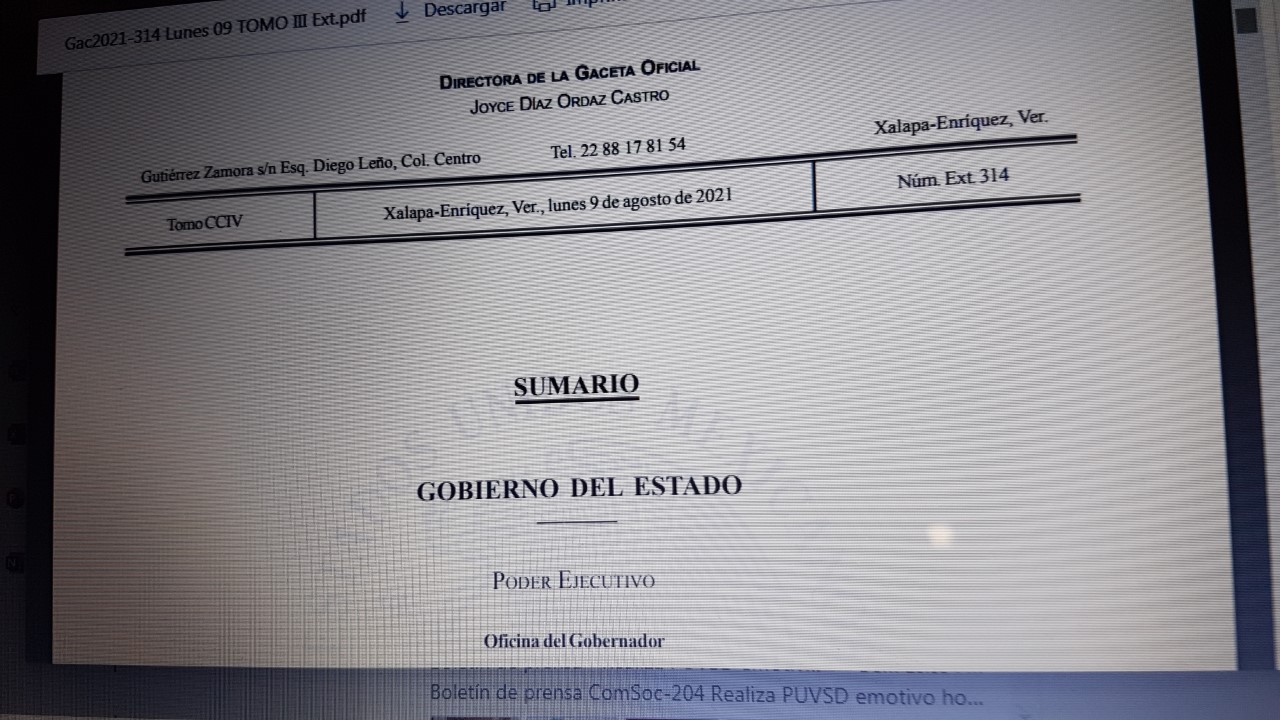 Estado de Veracruz de Ignacio de la Llave, Número Extraordinario 308, tomo II, el Acuerdo