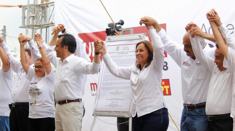 XALAPA,VER.-ABRIL 2018.-Al acompañar al candidato a gobernador de Veracruz, Cuitláhuac García Jiménez, a la firma de Acuerdo Estatal Por el Desarrollo del Campo, la candidata al Senado de la República por la alianza Juntos Haremos Historia, Rocío Nahle Garcia, pidió a las organizaciones campesinas promover y defender el voto.