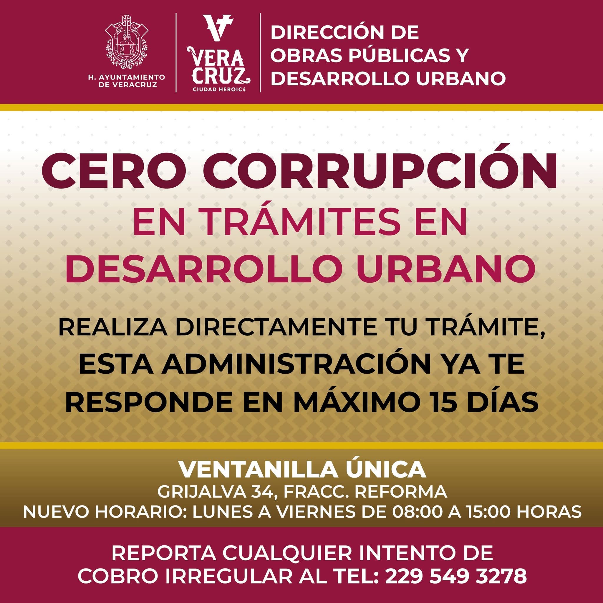 El Ayuntamiento de Veracruz reafirma su compromiso con una política de Cero Corrupción en todas sus áreas, destacando que los trámites de Desarrollo Urbano, que anteriormente podían tardar hasta cinco meses, hoy se realizan de manera directa, transparente y con respuesta en máximo 15 días.