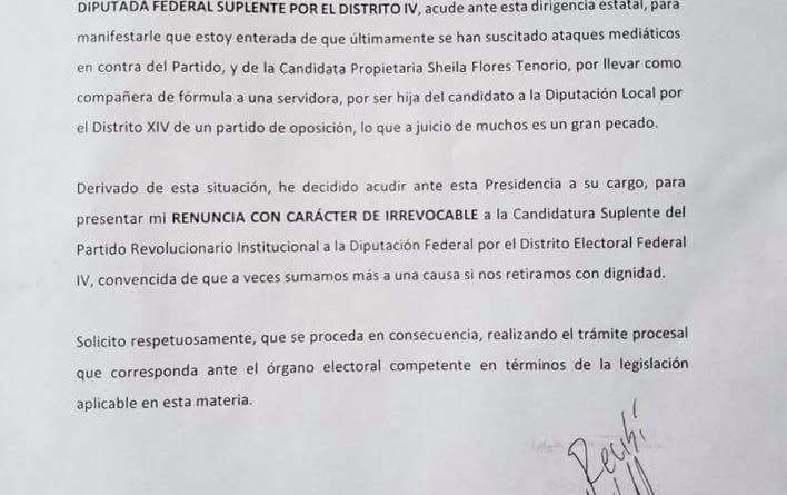 De acuerdo con el documento que llegó al CDE del PRI la renuncia es con carácter de irrevocable a la Candidatura Suplente del Revolucionario Institucional.