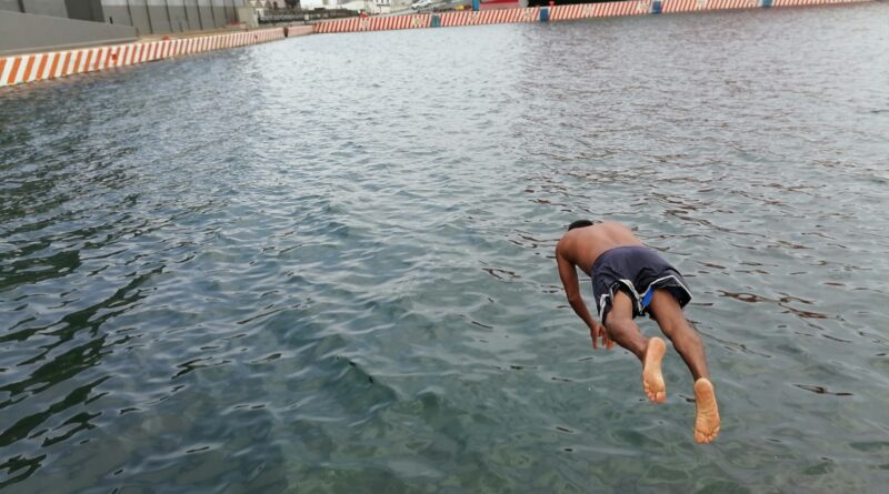 Veracruz,Ver.-a 6 de Junio 2023.- Los saca-monedas del Malecón de Veracruz además de ser unos buenos nadadores, se convierten en un atractivo más para los turistas quienes al arrojarles monedas se rien al verlos como de inmediato la sacan de la proundidad del Mar. Foto Ausencio RIVERA.