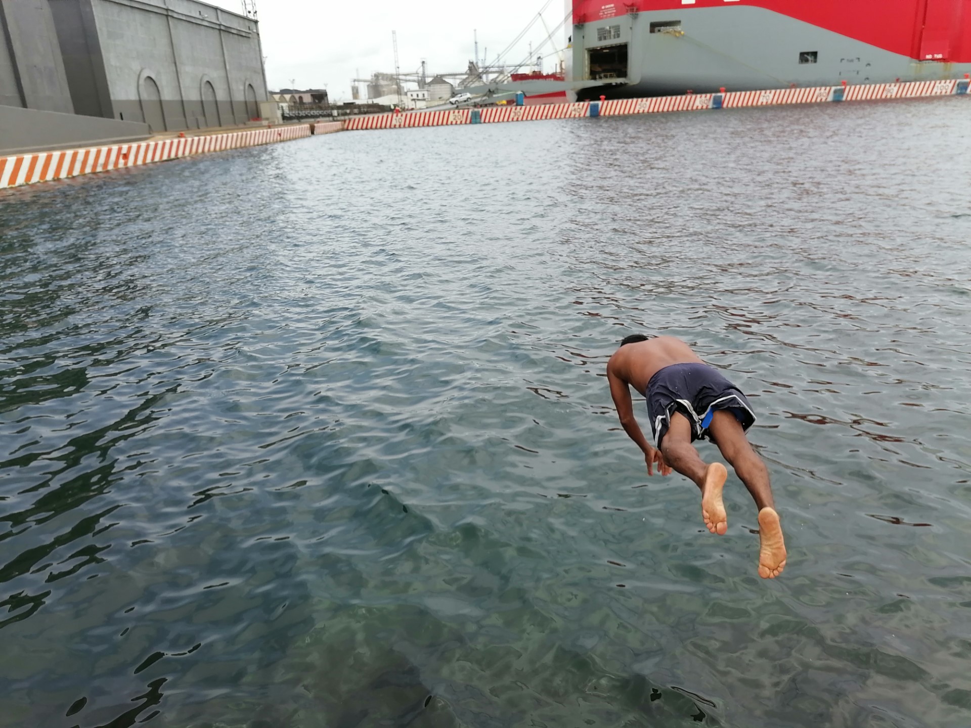 Veracruz,Ver.-a 6 de Junio 2023.- Los saca-monedas del Malecón de Veracruz además de ser unos buenos nadadores, se convierten en un atractivo más para los turistas quienes al arrojarles monedas se rien al verlos como de inmediato la sacan de la proundidad del Mar. Foto Ausencio RIVERA.