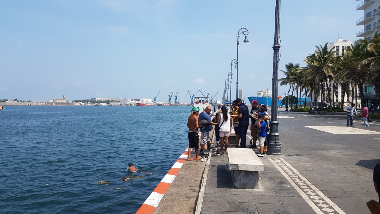 PIE DE FOTO. VER.- A 15 DE OCTUBRE 2021.- Los sacamonedas del Malecon sigien siendo un atractivo más para el turismo que visita a este puerto. Alrededor de una decena de ellos compiten para ver quien es el mejor nadador al traer las mondas que los turista arrojan para divertirse con ellos. FOTO ALEJANDRO MURRIETA.