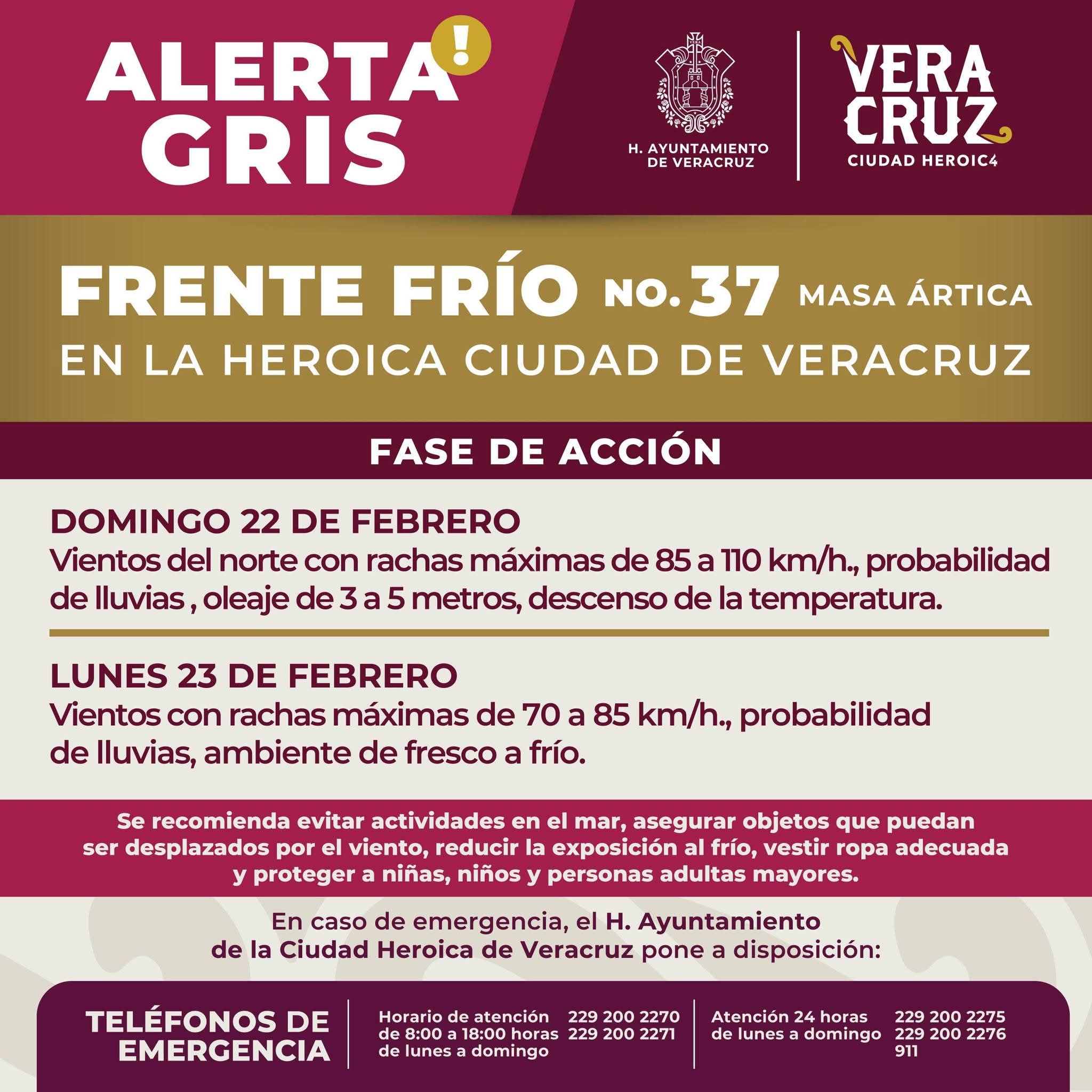 Veracruz, Ver.22 de Febrero 2026..La dirección de Protección Civil Municipal de Veracruz reiteró que prevalece la alerta gris en fase de acción, por el frente frío 37 y la masa ártica que lo impulsa, en su paso por el Golfo de México, manteniendo las condiciones de evento de norte que se intensifica, disminución de la temperatura y oleaje elevado.