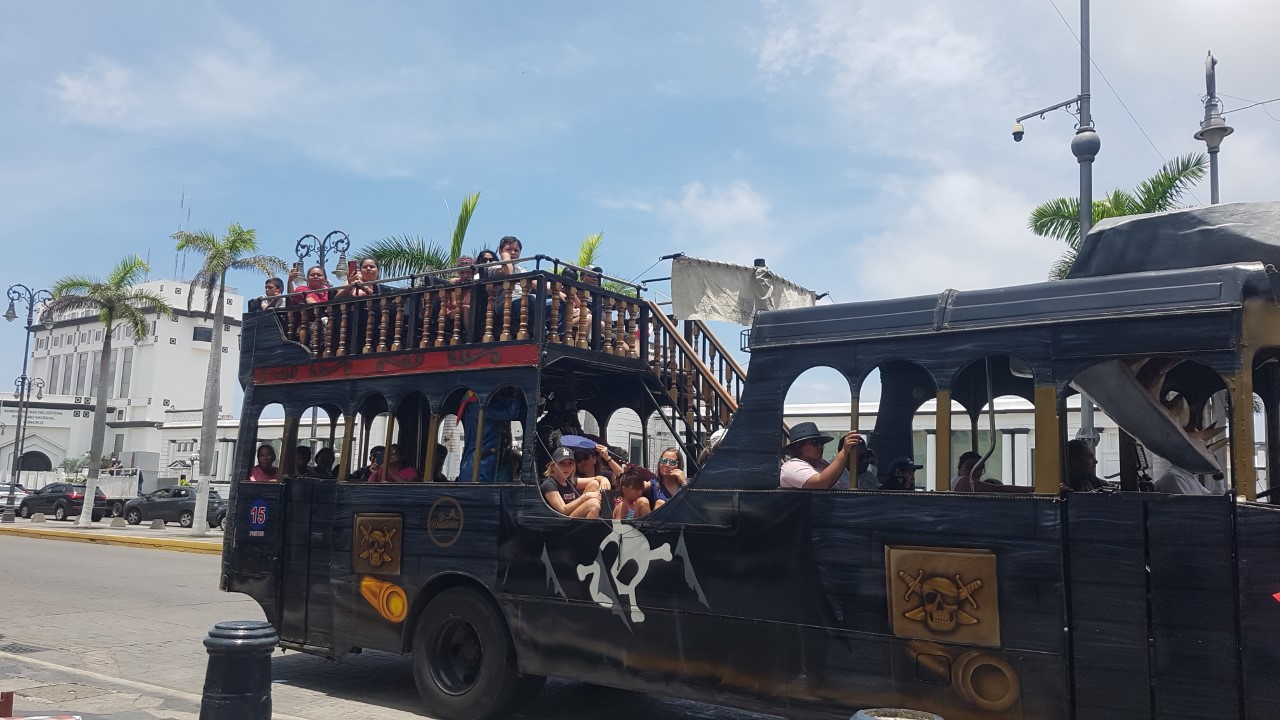 Veracruz,Ver.- a 12 de Agosto 2022.- Los servicios de los tranvías turísticos siguen a la alza en este periodo vacacional de Verano. Este viernes captamos a este tranvía repleto de turistas al circular por la Avenida Zaragoza de la Ciudad de Veracruz. Foto AusencIO RIVERA.