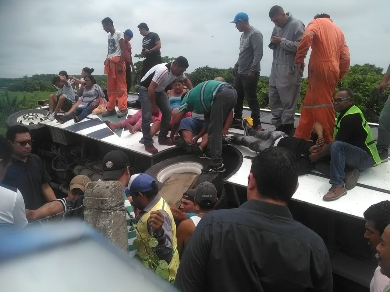 Veracruz,Ver.- 10 de Julio 2018.-Hasta el momento de redactar esta información(16 hora)elementos de la Cruz Roja Mexicana reportaban como saldo a 20 personas lesionadas entre ellos dos menores de edad como resultado de la volcadura de un camión de la ruta costera, hechos registrados este martes en la carretera Veracruz-Cardel, a la altura de la Colonia Chalchihuecan, Veracruz.